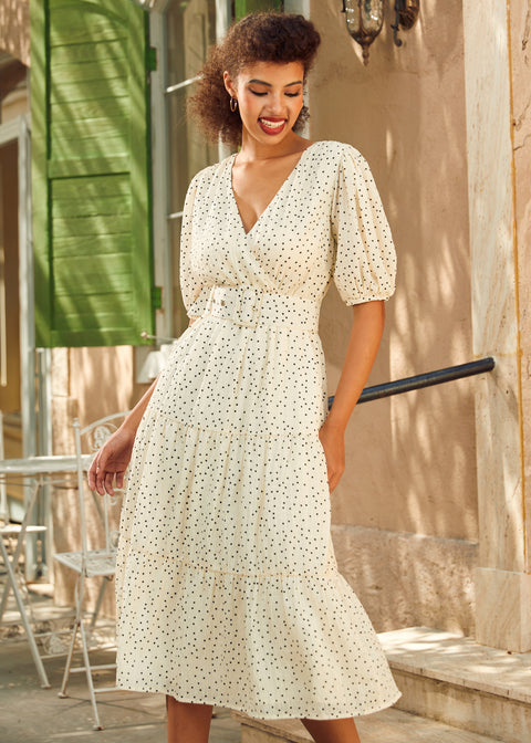 Elegant, nostalgisch en moeiteloos romantisch – de Lillian Pearl is een pareltje van het ModCloth-merk, geïnspireerd op de zachte glamour van de jaren 30. Met een overslagkraag, volumineuze ballonmouwen en een gelaagde midi-rok die zwierig meebeweegt, brengt deze jurk vintage dagdromen tot leven. Of je nu thee drinkt op de veranda of ronddraait onder de lichtslingers, de zachte stof en het tijdloze silhouet maken dit een kledingstuk om nu en voor altijd te koesteren.