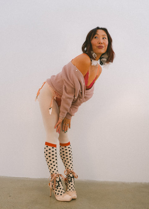 Onze favoriete doorschijnende sokken met stippen en strik voor de herfst zijn nu ook verkrijgbaar in knielengte! Deze sokken zijn ontworpen om de aandacht te trekken en elke outfit een boost te geven. De klassieke zwarte stippen zijn gecombineerd met een strik op de enkel voor extra vrouwelijkheid. Afgewerkt met een verstevigde katoenen rode boord, teen en hiel voor een opvallend kleuraccent. Combineer ze met een knielange jurk voor een chique look op het werk, of ga voor een trendy look en draag ze over een gekleurde panty. Eén maat. Aanbevolen voor dames met schoenmaat 5,5-9,5 (Amerikaanse maten). 200 naalden. Funky maar elegant – geen gekke of kinderachtige patronen