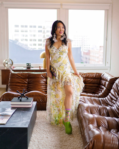 Geïnspireerd door de trouwkleuren van onze oprichtster, vormen delicate lavendel- en gele bloemen op groene ranken twee ineengestrengelde harten bij de enkel. Perfect te combineren met bloemenjurken en bruidslooks. Voeg een zacht romantische touch toe met deze doorschijnende bloemensok. Afgewerkt met een lavendelkleurige boord en enkel voor een extra vrouwelijke uitstraling. Eén maat. Aanbevolen voor damesschoenmaten 5,5-10 (VS). 200 naalden. Trendy en elegant – geen gekke of kinderachtige patronen. Premium kwaliteit – duurzaam gemaakt met comfortabele stretch. Uniek – het perfecte accessoire om je outfits een persoonlijk tintje te geven.