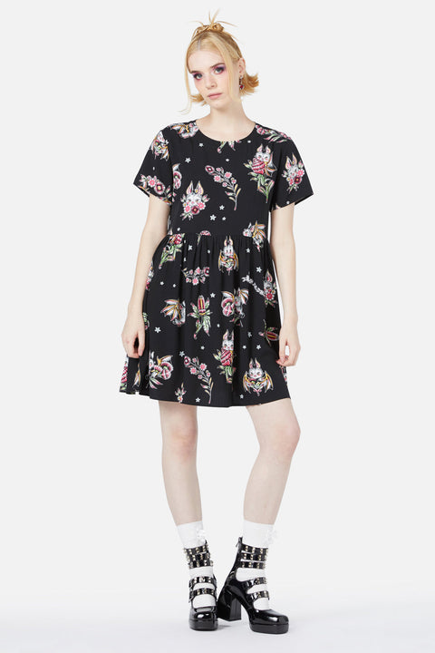 De all-over ‘Fruity Bats’-print, een betoverende samenwerking met kunstenares Ella Mobbs, geeft deze jurk een gedurfde en kleurrijke touch. Gemaakt van zachte geweven viscose, is hij verkrijgbaar in opvallend zwart of dromerig lila – ideaal voor wie een statement wil maken met zijn of haar stijl.