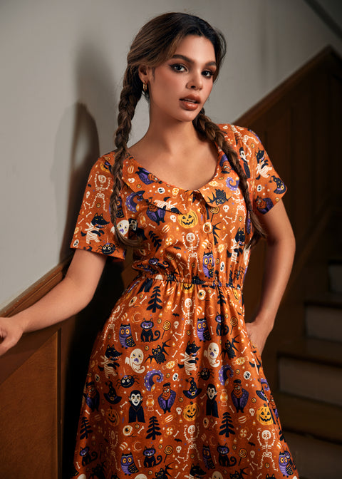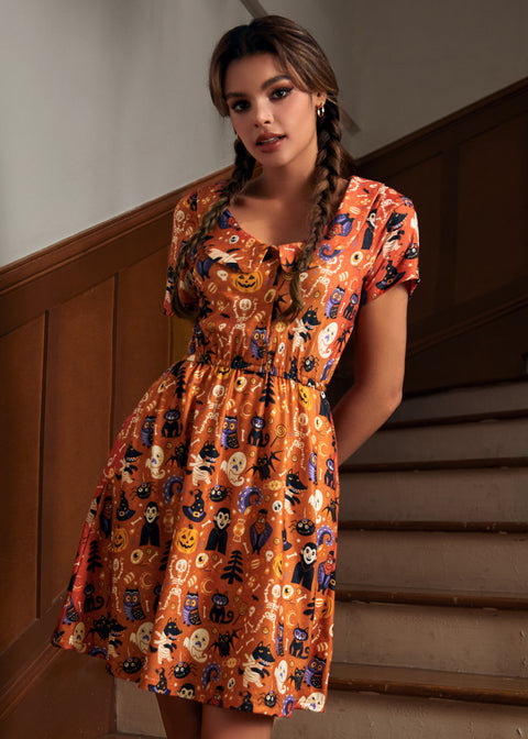 Stap in de wereld van griezelige chic met de Ghouls Just Wanna Have Fun Dress van ons eigen ModCloth-merk. Deze jurk met korte mouwen en uitlopende rok heeft een ronde halslijn met een afgeronde kraag, een knoopsluiting aan de voorkant en een elastische tailleband voor comfort de hele dag door. Compleet met zakken, is deze jurk afgewerkt met de Sweet Shiver-print – een eigenzinnige mix van uilen, zwarte katten, skeletten, snoep en pompoenen – waardoor het een griezelig leuke keuze is voor Halloween en daarna.