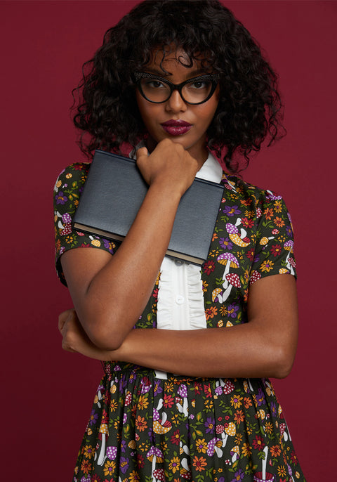 Als eerbetoon aan ons originele logo presenteren we u met veel plezier een prachtige nieuwe, handgetekende print met een weelderige, mosgroene bosbodem vol schattige paddenstoelen in rode, gele en paarse tinten, omringd door vrolijke bloemen en kleine kevertjes. Deze charmante jurk met een aansluitende taille en uitlopende rok is gemaakt van een lichtgewicht geweven stof en valt op door de contrasterende witte puntkraag en de met ruches afgewerkte knoopsluiting op het lijfje. Met korte mouwen en een bijpassende, afneembare riem in de geplooide taille die overgaat in een uitlopende rok tot boven de knie met handige zijzakken, is deze mini-jurk in jaren 70-stijl een absolute aanrader.