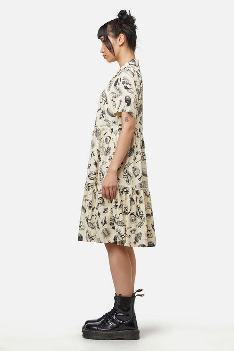 Deze unieke babydoll-jurk combineert een grafische flair met moeiteloos comfort. Met de exclusieve ‘Body Fossils’-print heeft de jurk een relaxte, oversized pasvorm met T-shirtmouwen en een knoopsluiting aan de voorkant, wat zorgt voor een casual maar toch edgy look. Gemaakt van zachte viscose, is deze jurk perfect voor een gemakkelijke styling en comfort.