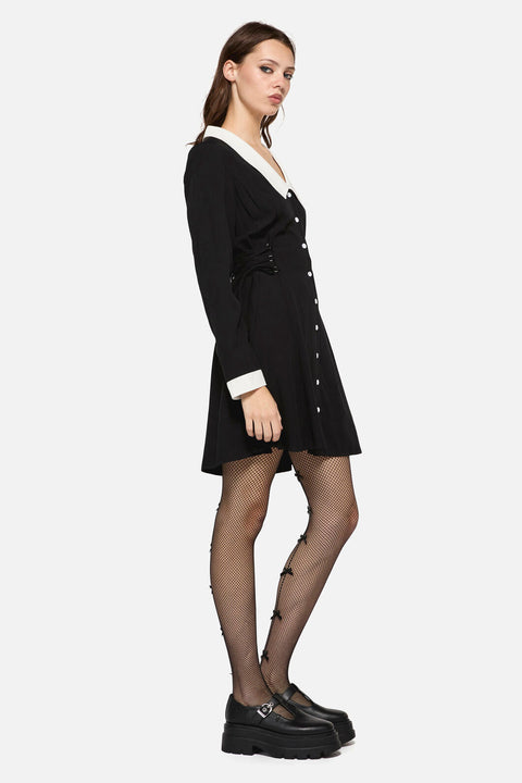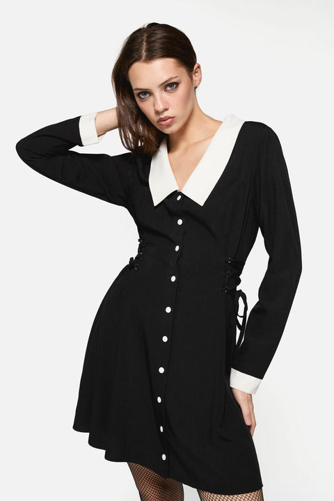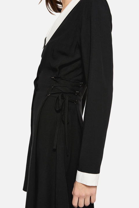 Straal romantische gothic energie uit met deze moeiteloos dramatische midi-jurk. Ontworpen met elegante contrasterende details en korsetachtige strikjes in de taille voor een aanpasbare pasvorm.