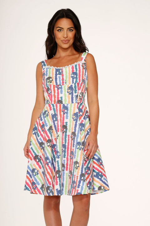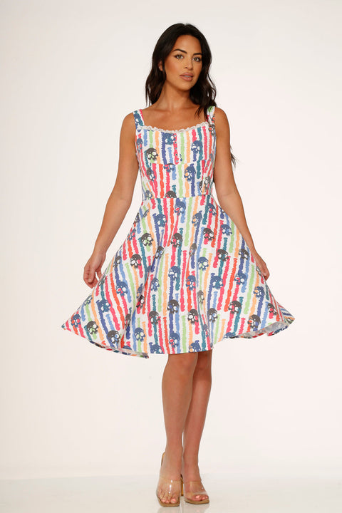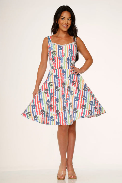 Breng een energieke en kleurrijke draai aan je outfit met de Orchid Bloom White Skulls Rainbow Swing Dress! Deze retro-geïnspireerde jurk met een speelse print van levendige regenboogschedels op een helderwitte achtergrond is een perfecte mix van lief en rebels. Gemaakt van een comfortabele katoen-spandexmix, is hij klaar voor zonneschijn, lachende gezichten en om overal een statement te maken.