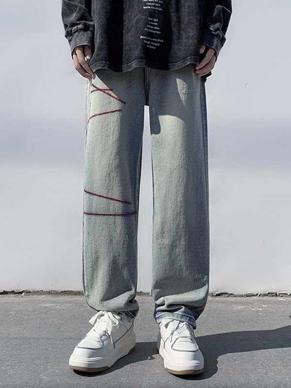 Descripción: Estos jeans lavados para hombre tienen detalles de costuras en contraste en la pierna, cuenta con detalles rasgados ligeramente desgastados, bragueta con cremallera y botón de metal y diseño de múltiples bolsillos.