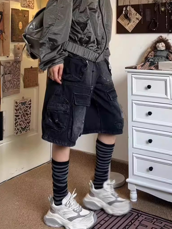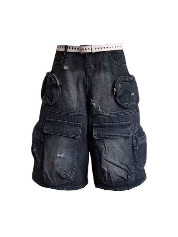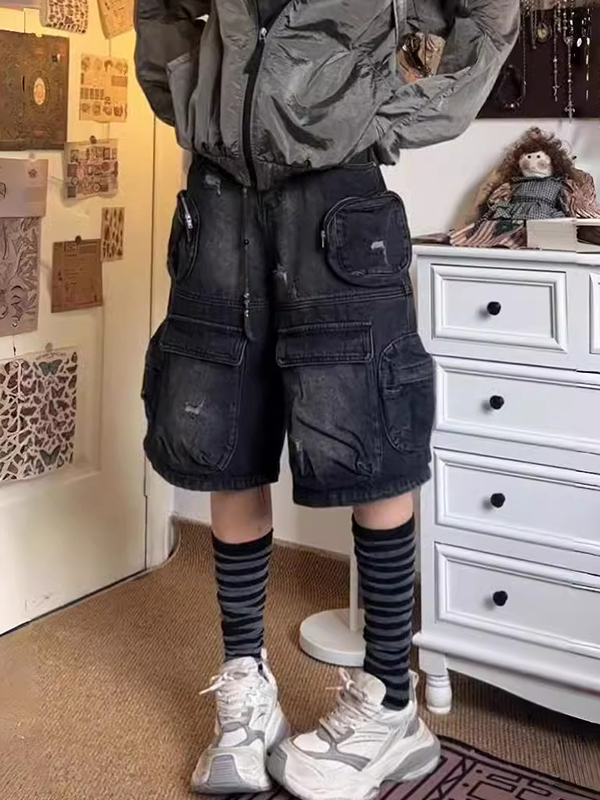 Pantalones cortos de mezclilla lavados con múltiples bolsillos