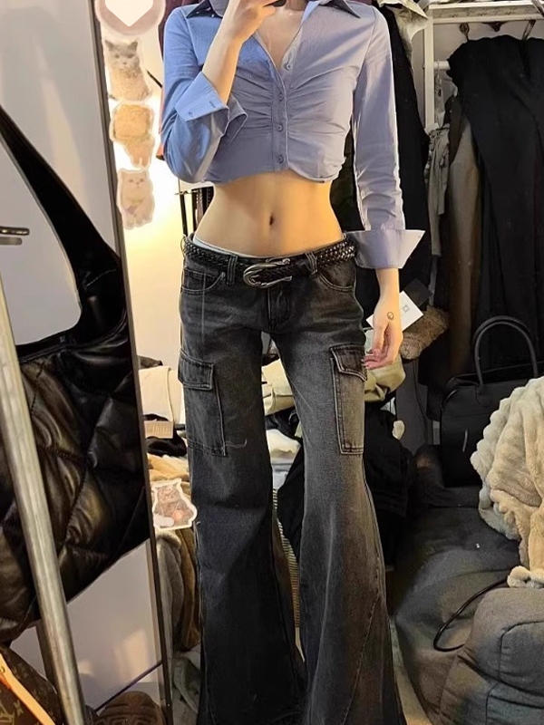 Vaqueros acampanados ajustados con múltiples bolsillos